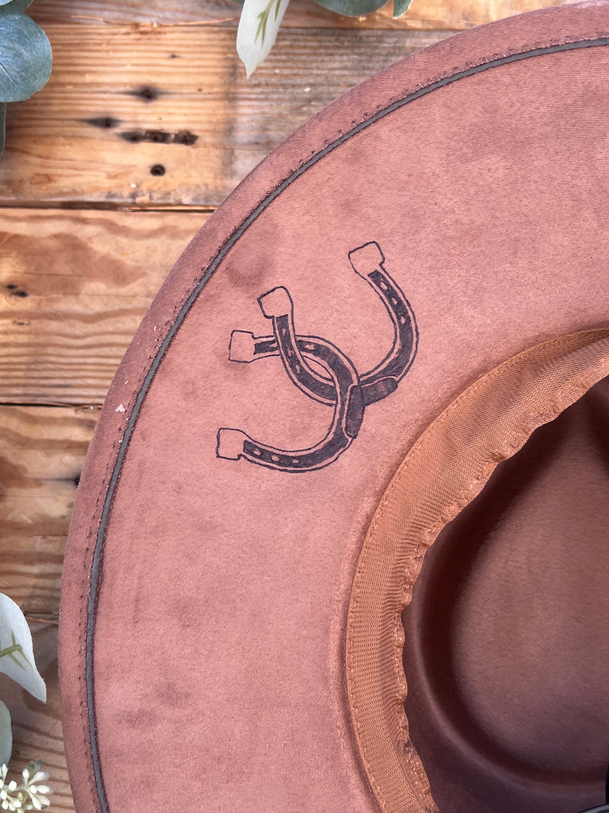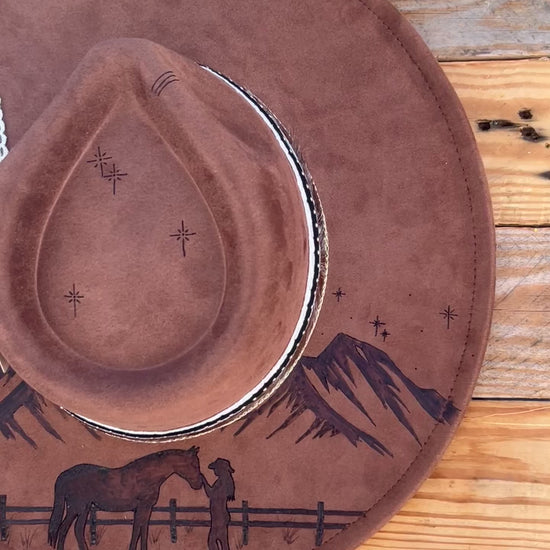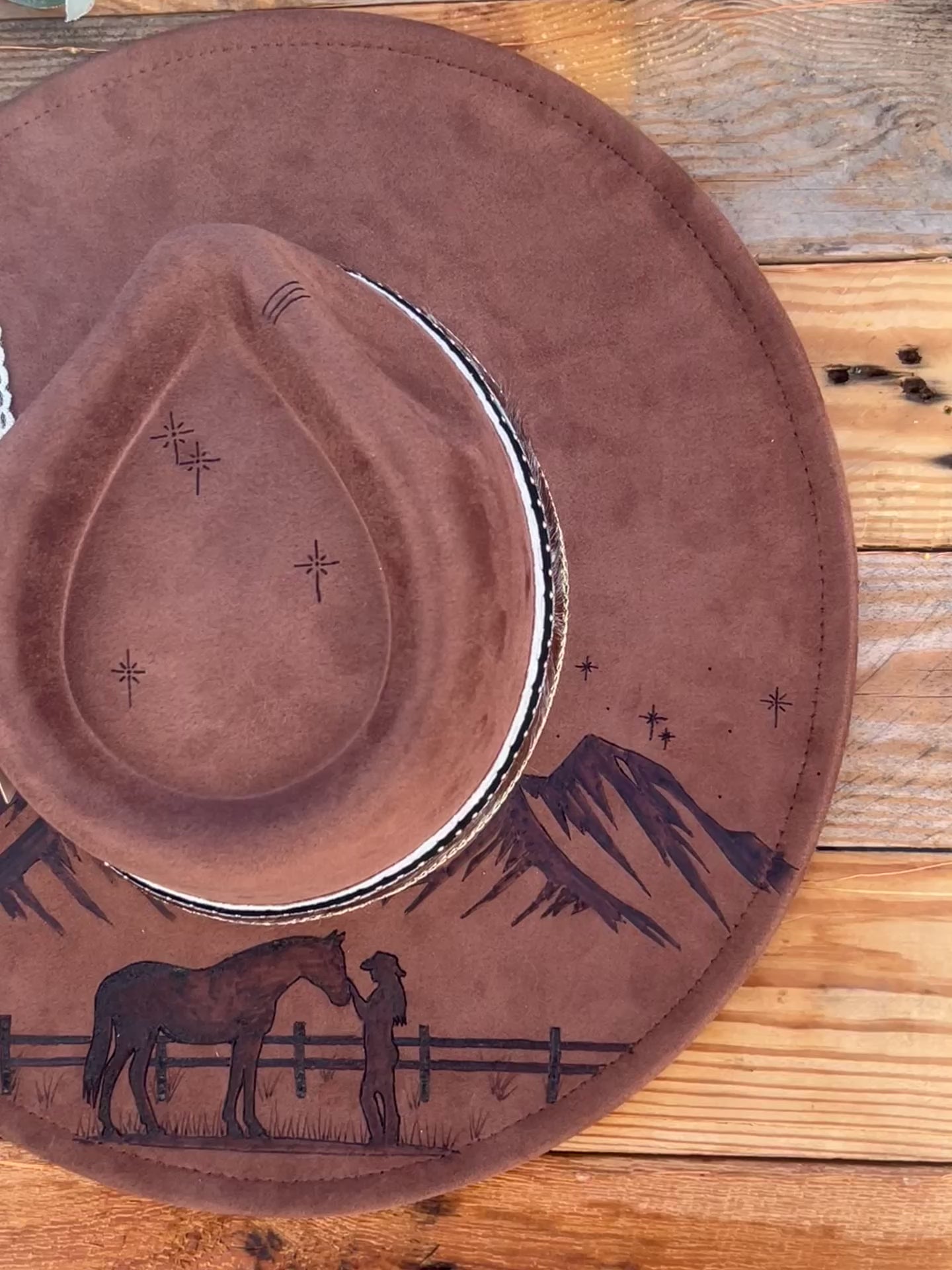 This rich brown felt hat features a hand-burned scene wrapping the brim. A cowgirl standing beside her horse along a fence line with mountains rising in the background beneath a starlit sky. Each detail is carefully burned by hand, making every hat a truly one-of-a-kind piece of wearable art.